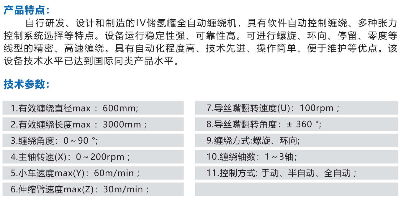 遠(yuǎn)望智造,用實力創(chuàng)造價值! 我們在自動化設(shè)備制造領(lǐng)域,無所不能,無所不精! 自行研發(fā),設(shè)計和制造的IV儲氫罐全自動纏繞機(jī),具有軟件自動控制纏繞,多種張力控制系統(tǒng)選擇等特點(diǎn)。設(shè)備運(yùn)行穩(wěn)定性強(qiáng),可靠性高。可進(jìn)行螺旋、環(huán)向、停留、零度等線型的精密、高速纏繞。